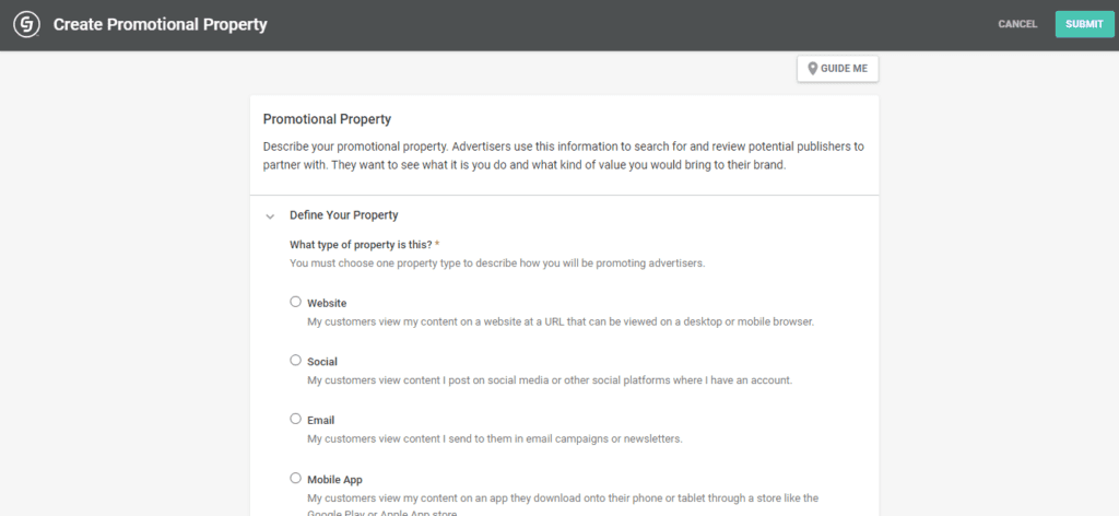 A Promotional Property is the media through which your customers can view your content. The “Create Promotional Property” page offers several types to choose from, including:
