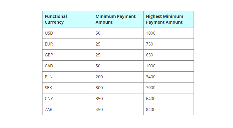 For example, let’s say your functional currency is US Dollars. You can choose the default minimum payment, which means you’ll get paid when you have $50 in closed commissions, or you could pick a higher amount like $150. But if you want to set it at $2,000 or more, nope – sorry! That’s over the maximum of $1,000.